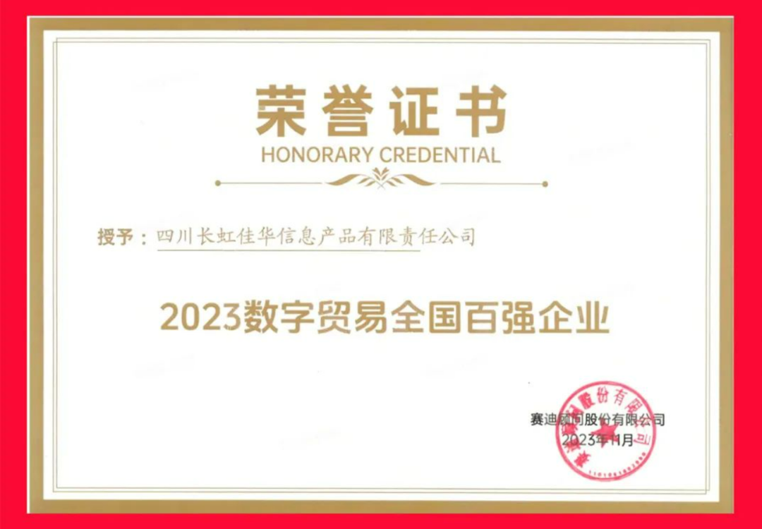 Digital trade results conference was held in Hangzhou International Expo Center, at which the 2023 digital trade enterprises Top 100 list was released. Changhong Jiahua successfully made the list with its excellent digital intelligence comprehensive service ability, and it was also the only one listed enterprise in Sichuan Province. All along, Changhong Jiahua has always taken innovation as the driving force, continuously increased technological investment in the field of digital trade, continued to deepen the construction of intelligent business and digitalization, deeply participated in the construction and layout of digital trade industry chain, connected multi-field and multi-industry ecological partners, and jointly promoted the development of digital trade.