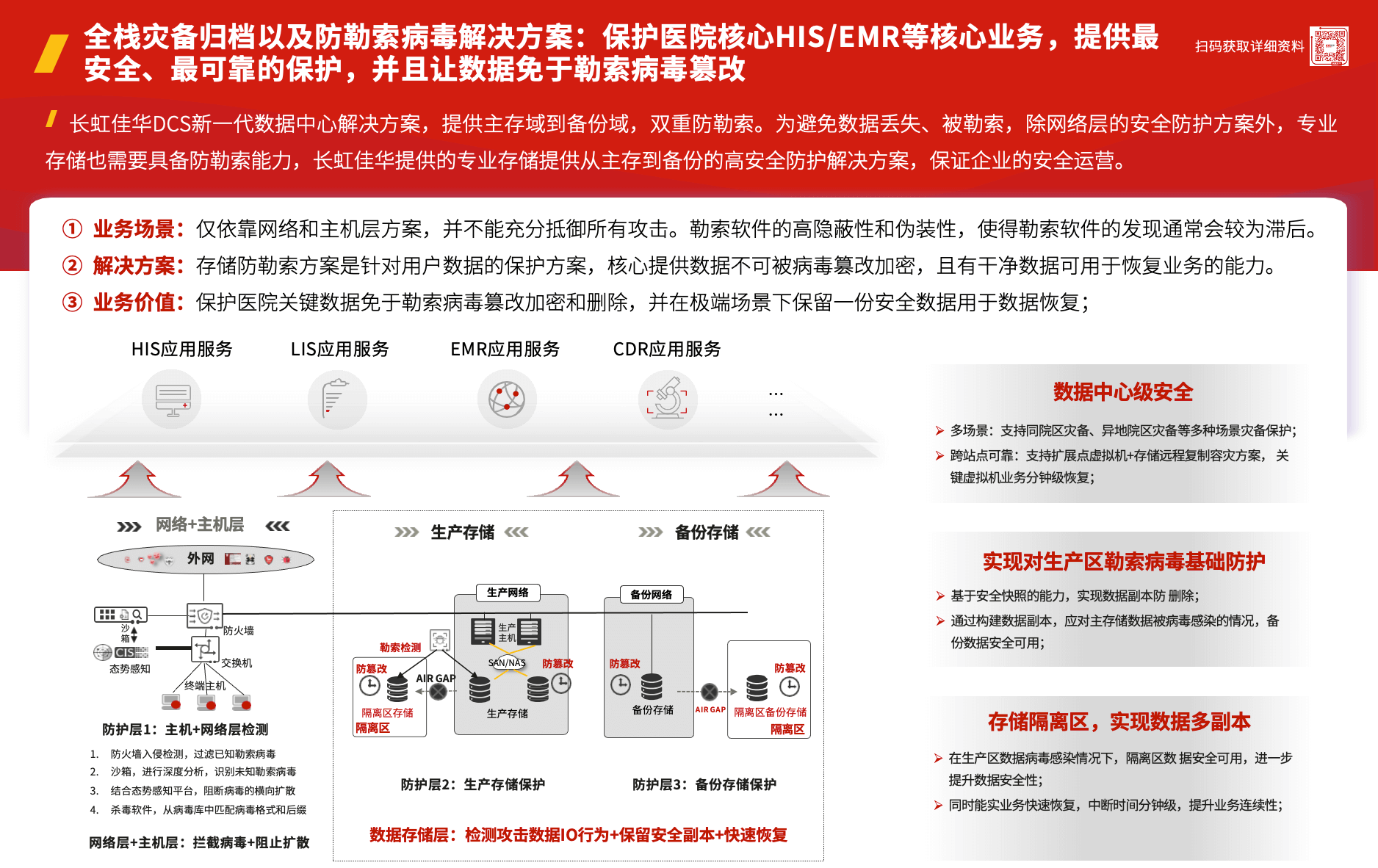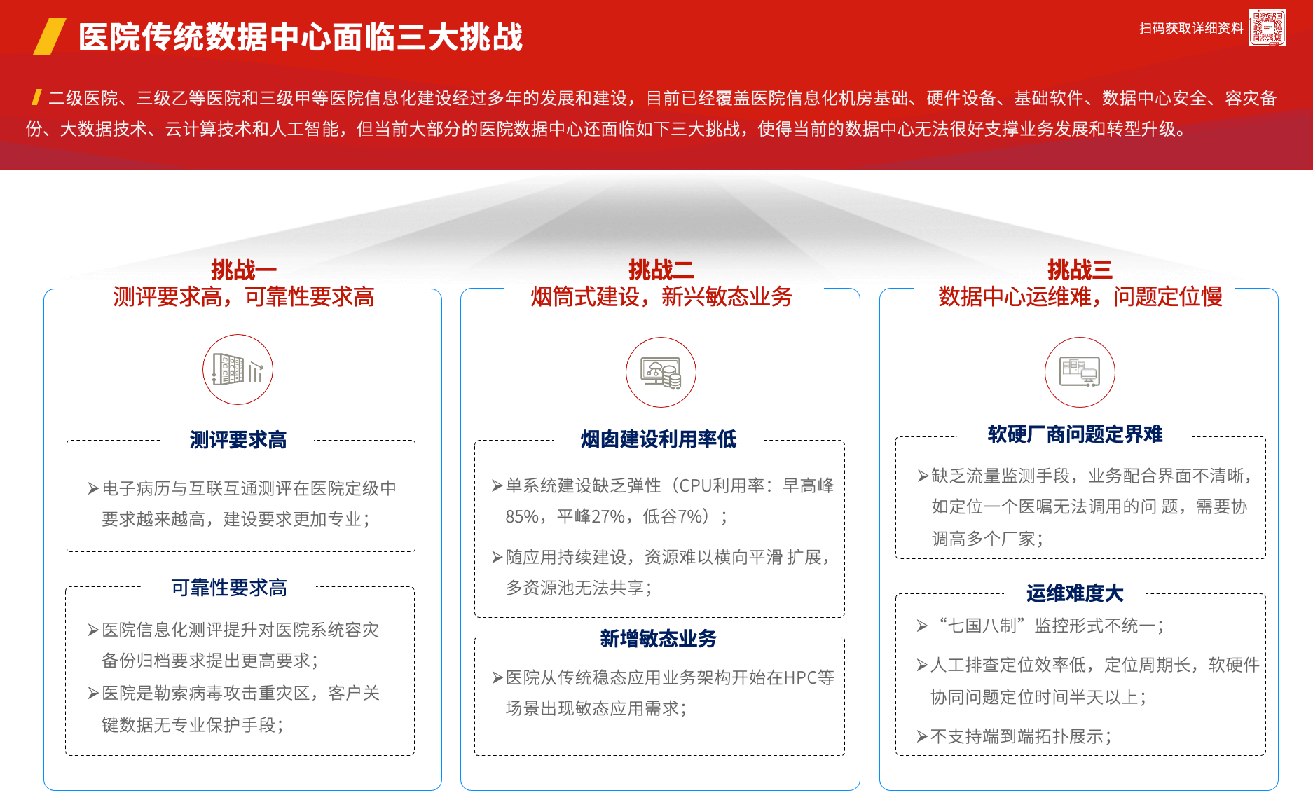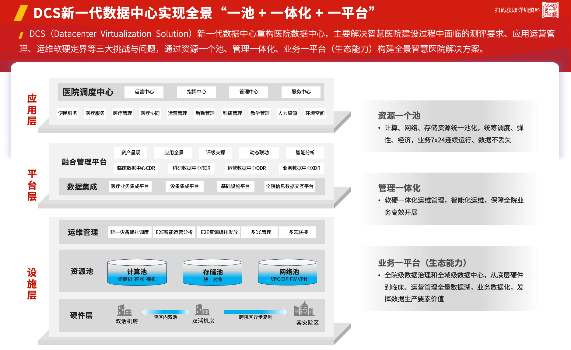 DCS(Datacenter Virtualization Solution)新一代数据中心重构医院数据中心,主要解决智慧医院建设过程中面临的测评要求、应用运营管理、运维软硬定界等三大挑战与问题,通过资源一个池、管理一体化、业务一平台(生态能力)构建全景智慧医院解决方案。