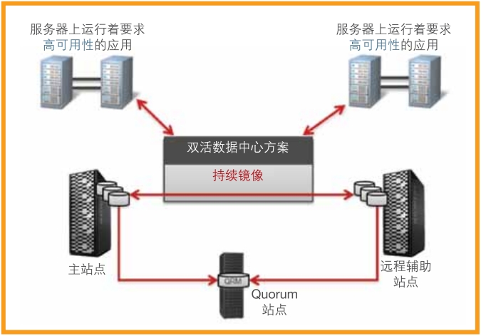 双活数据中心方案让高可用变得简单和自动化,以确保最关键的数据和应用的持续运行。该功能支持同时在两个地方保存同一数据的读/写副本。其双活设计可以在两个存储系统之间实现交叉镜像存储卷,这两个存储系统能够在两端同时接受读/写I/O操作并持续进行更新。如果一个站点的磁盘控制柜发生故障,另一个站点的控制柜将自动接管并继续接受读/写I/O操作。双活数据中心方案可确保最新的存储卷始终可用,并在这两个系统上支持生产工作负载,同时保持完整的数据一致性和数据保护能力。