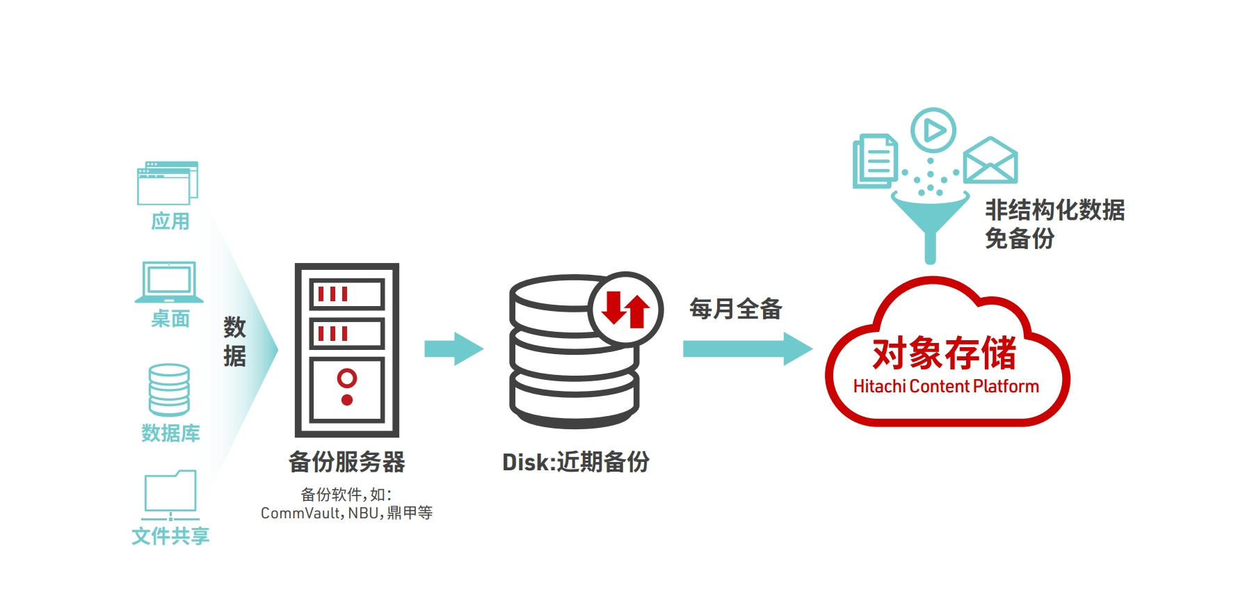 ■非结构化数据免备份;除了传统结构化数据的备份保存在HCP 对象存储之外,对于非结构化的数据,比如文档,图片,视频等可以通过应用端S3 协议直接写入对象存储,需要时直接调取数据,无需恢复操作,激活了数据的价值。