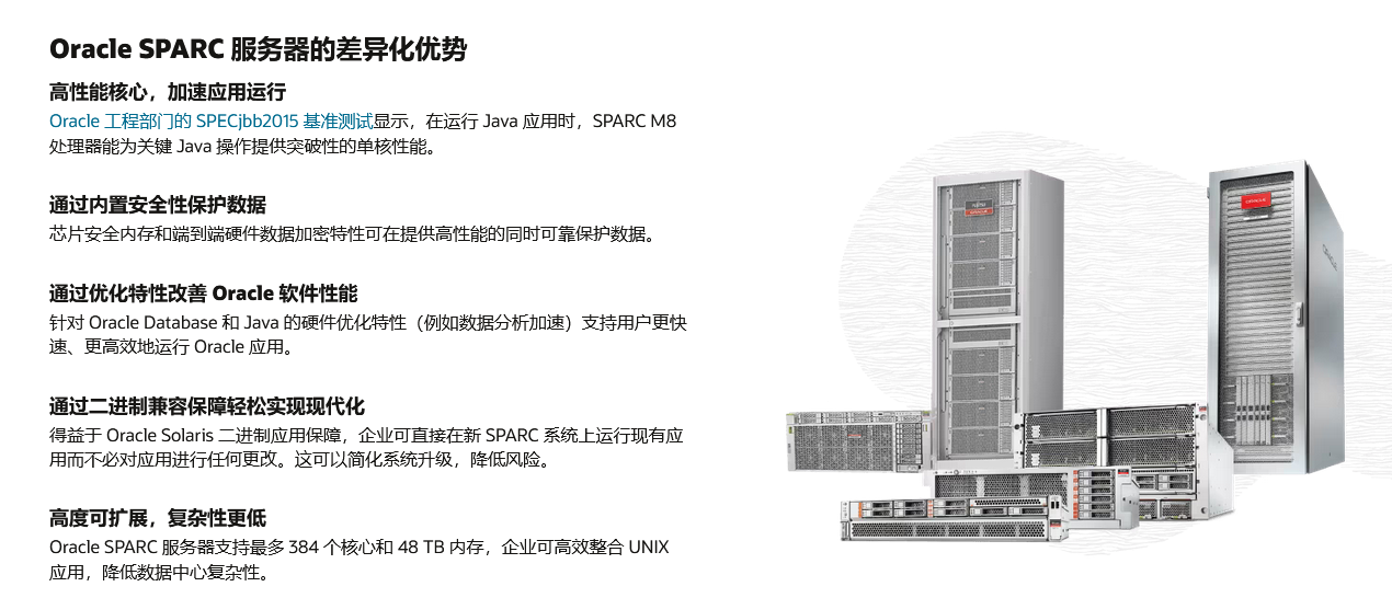 从入门级到高端服务器,满足纵向扩展、横向扩展和边缘等多种部署需求;SPARC 服务器满足企业对经济可靠的 UNIX 解决方案的需求;每台 Oracle x86 服务器都免费附带 Oracle Linux(或 Oracle Solaris)和 Oracle VM。