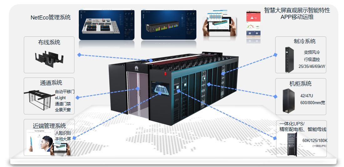 FusionModule2000是华为新一代智能微模块,致力于为用户提供极简、绿色、智能、安全的数据中心解决方案。 FusionModule2000采用模块化设计,将智能母线、温控、机柜、通道、布线、监控等集成在一个模块内。 FusionModule2000具有一体化集成,安全可靠,节省机房占地面积和节约能源,安装省时、省力、省心,架构兼容,快速灵活部署,智能化监控,高效稳定制冷等特点。与此同时,华为智能微模块通过i3构筑核心子系统智能化,全面提升供配电、温控系统可靠性、节能性,并引入AI技术,实现供配电和制冷的智能联动控制,并对机房资产进行自动化管理,显著提升数据中心的可靠性、可用性及运维效率。