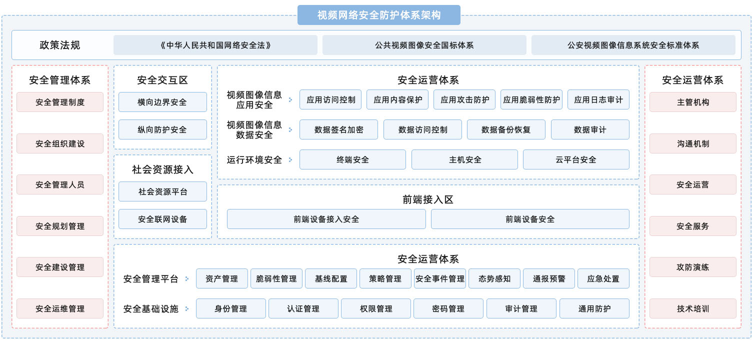以等保2.0、网络安全法、数据安全法、公共视频图像安全国标体系等标准法规为基准构建前端合法接入、边界合规交互、系统安全可用、全网可管可控的视频安全体系。