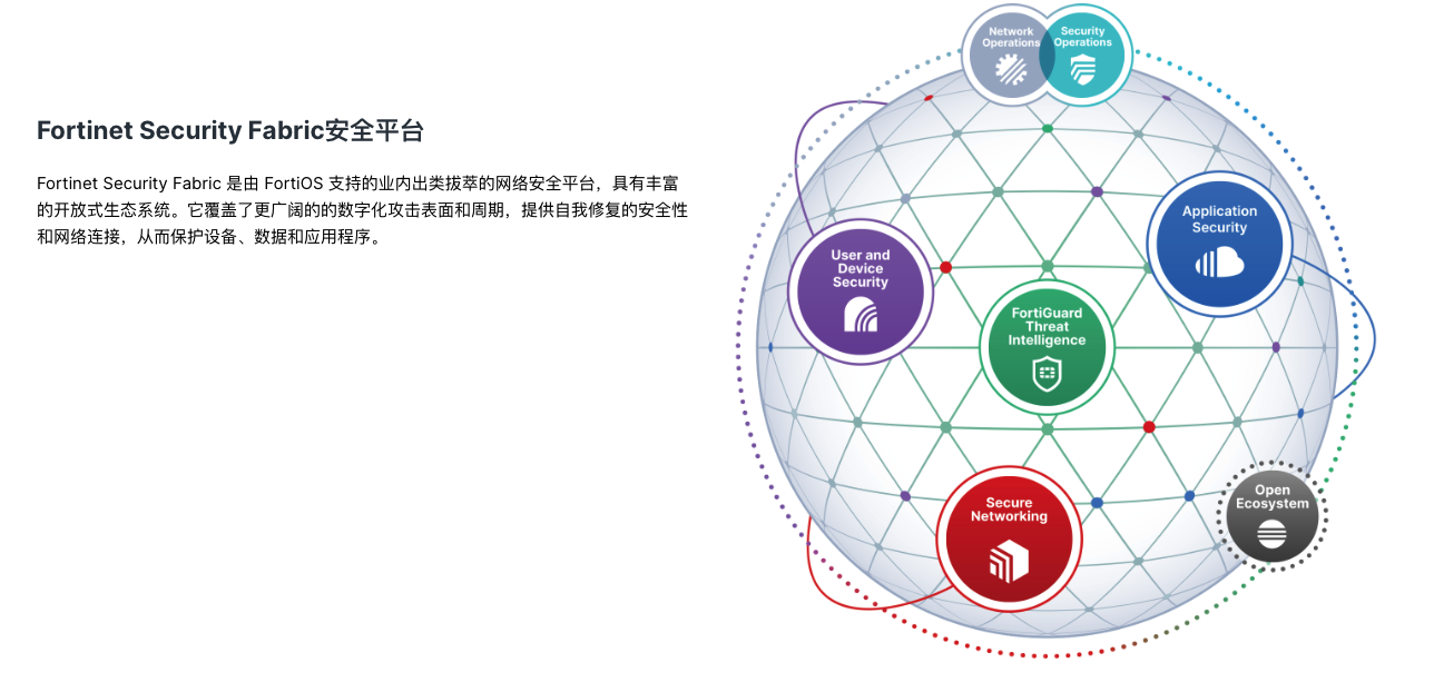 Fortinet Security Fabric 是一种综合性的网络安全架构,旨在提供端到端的保护、可见性和自动化。该解决方案基于一系列 Fortinet 产品和服务,通过集成和协同工作,为组织提供更强大、更智能的安全性。
