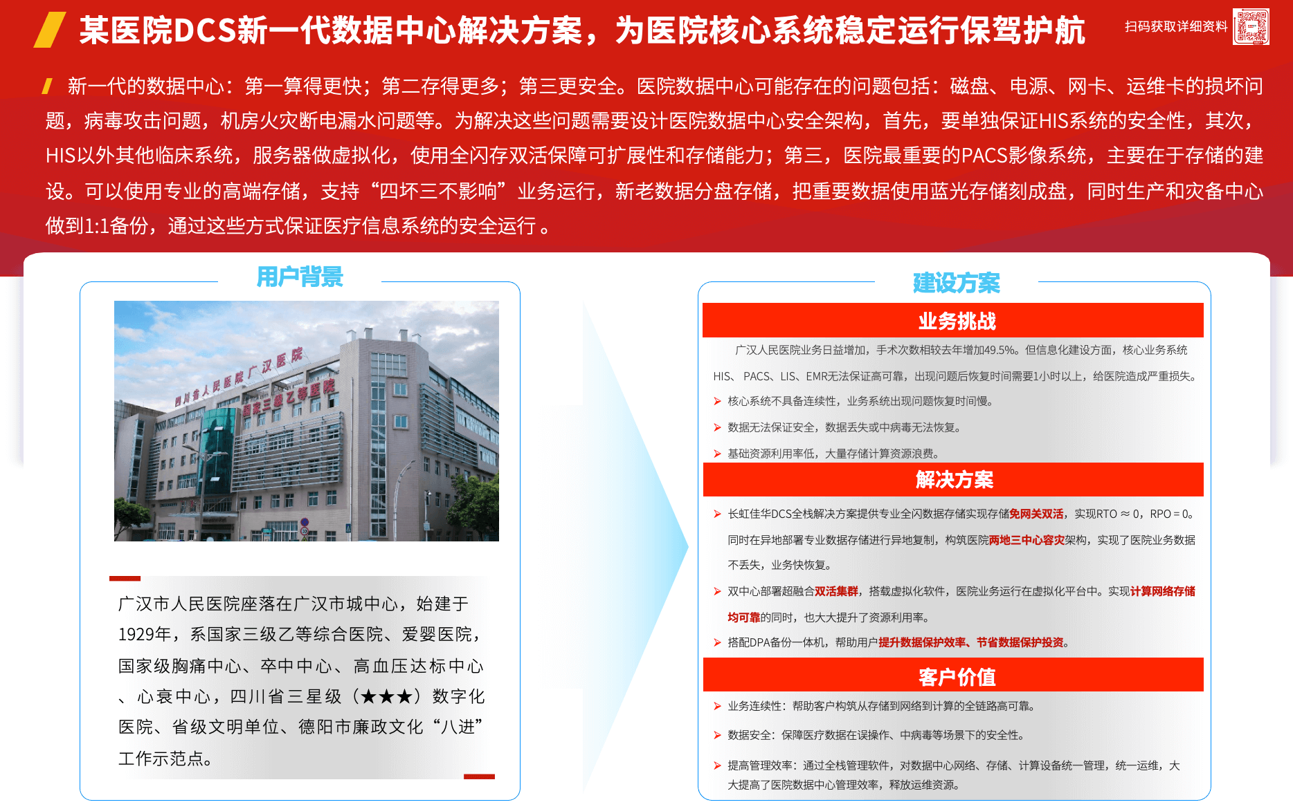 DCS(Datacenter Virtualization Solution)新一代數據中心重構醫院數據中心,主要解決智慧醫院建設過程中面臨的測評要求、應用運營管理、運維軟硬定界等三大挑戰與問題,通過資源一個池、管理一體化、業務一平臺(生態能力)構建全景智慧醫院解決方案。