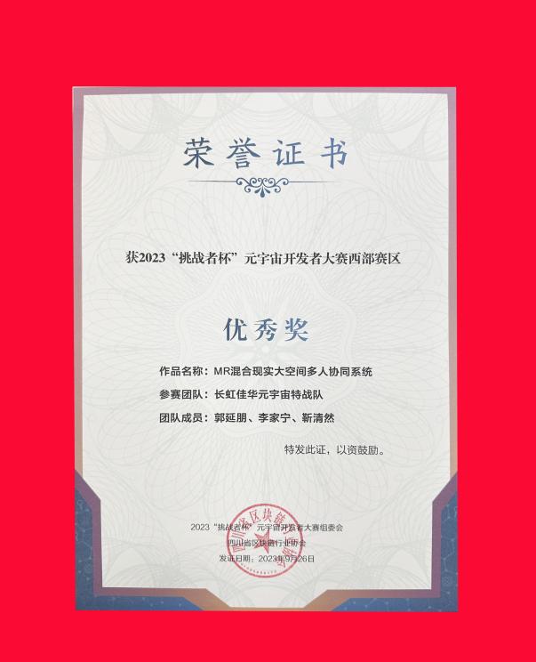 2023年获得由四川省区块链行业协会颁发的2023“挑战者杯”元宇宙开发者大赛西部赛区优秀奖
