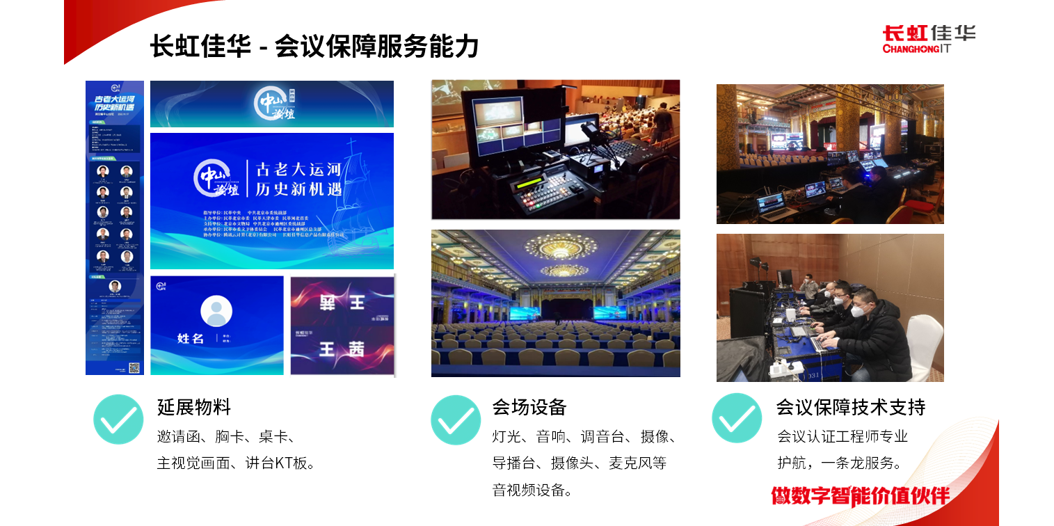 长虹28多多拥有由20余位技术工程师组成专业会议保障团队,项目经验丰富。在线下+线上的混合会议场景中,提供包括会场勘测、保障方案制定、会议账号下发、设备和网络支持、会场搭建、技术联调和流程彩排在内的一站式会务策划和保障服务。