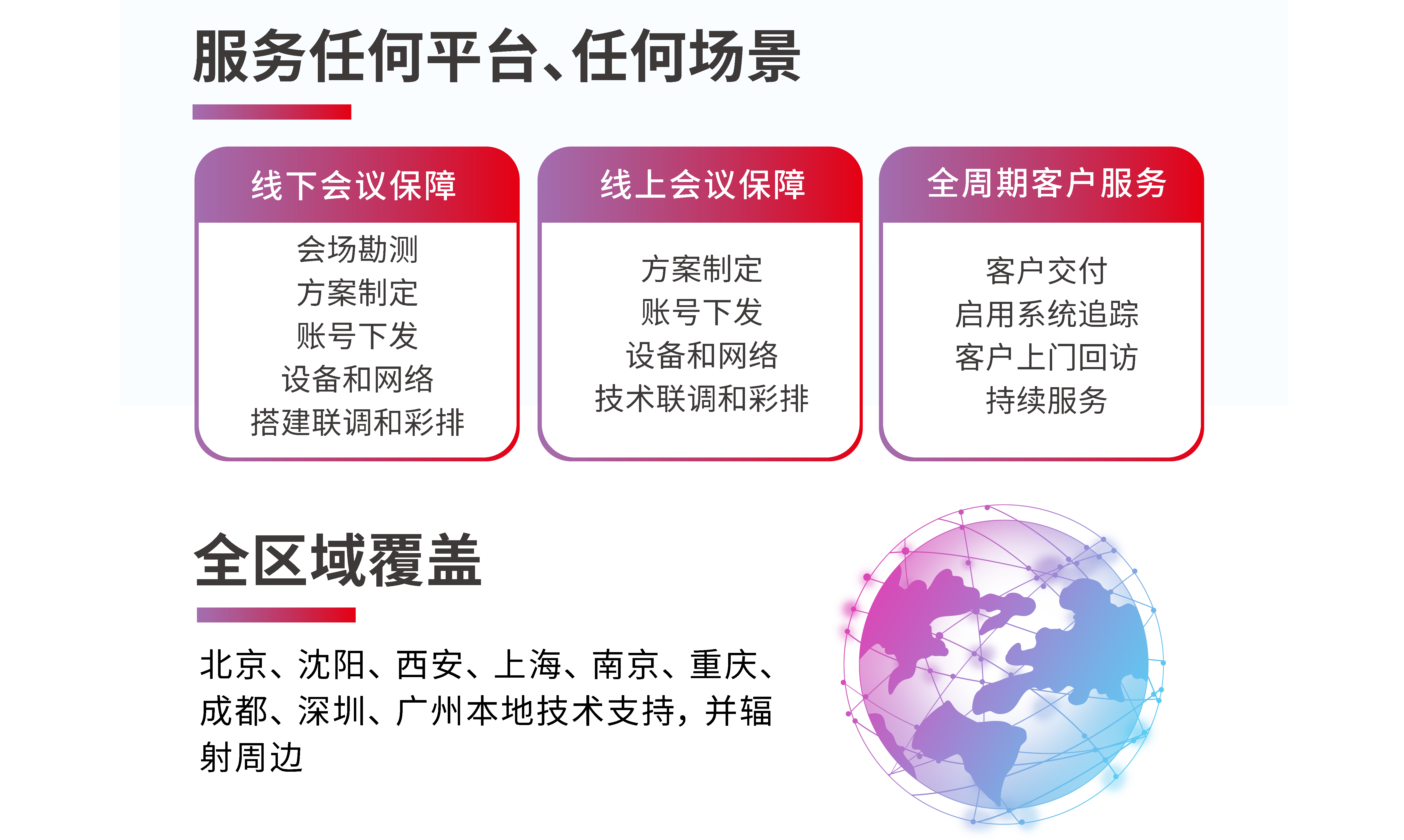 在线下+线上的混合会议场景中,提供包括会场勘测、保障方案制定、会议账号下发、设备和网络支持、会场搭建、技术联调和流程彩排在内的一站式会务策划和保障服务。