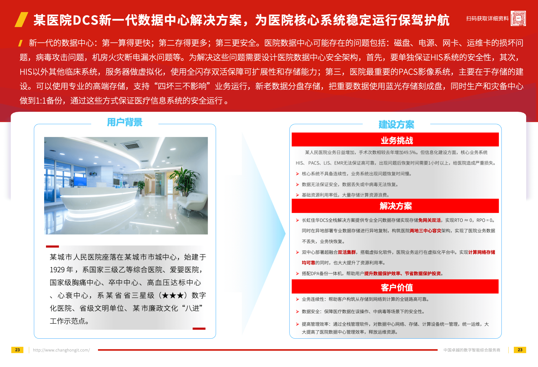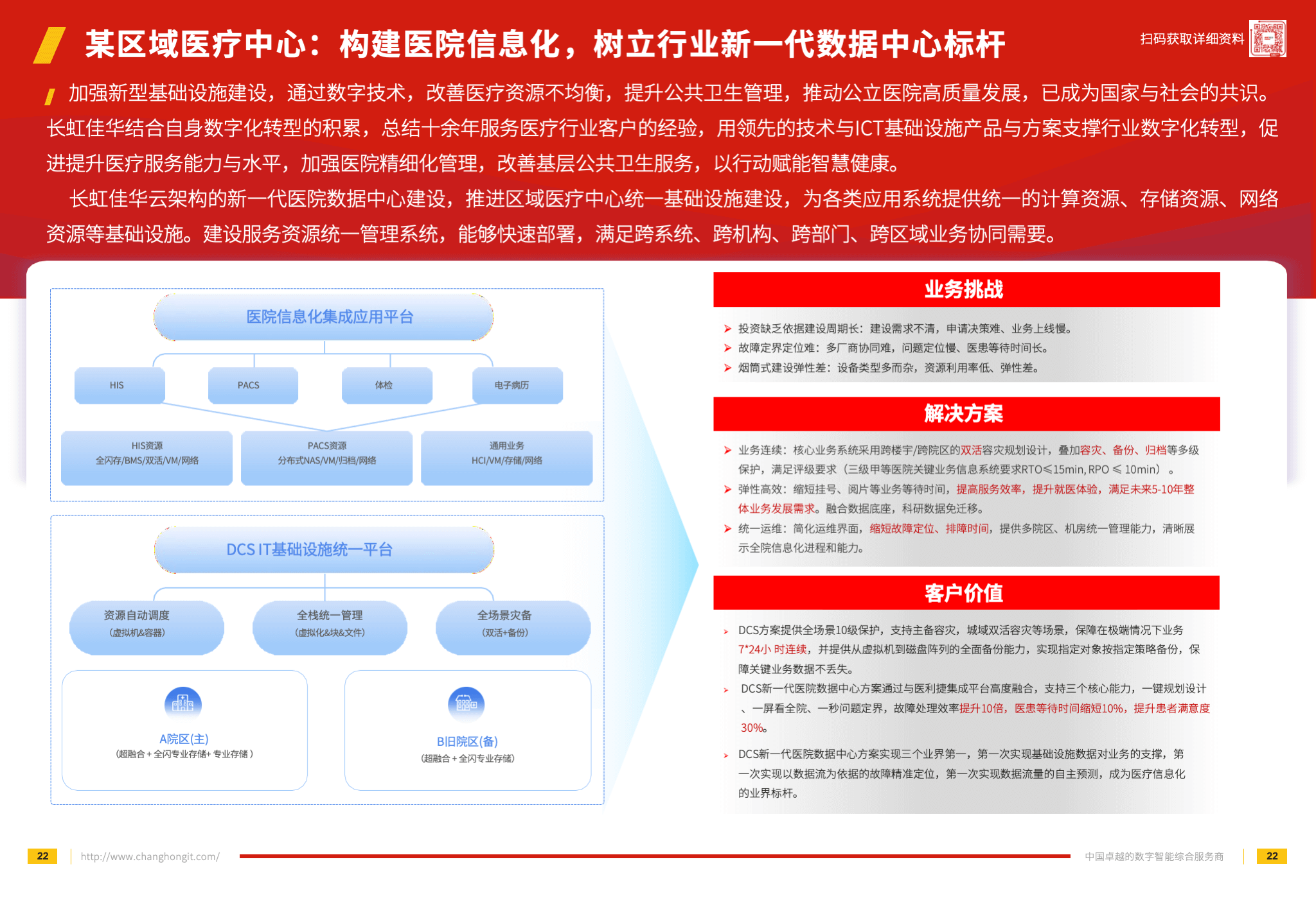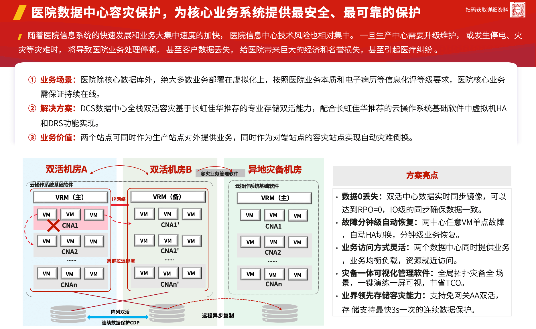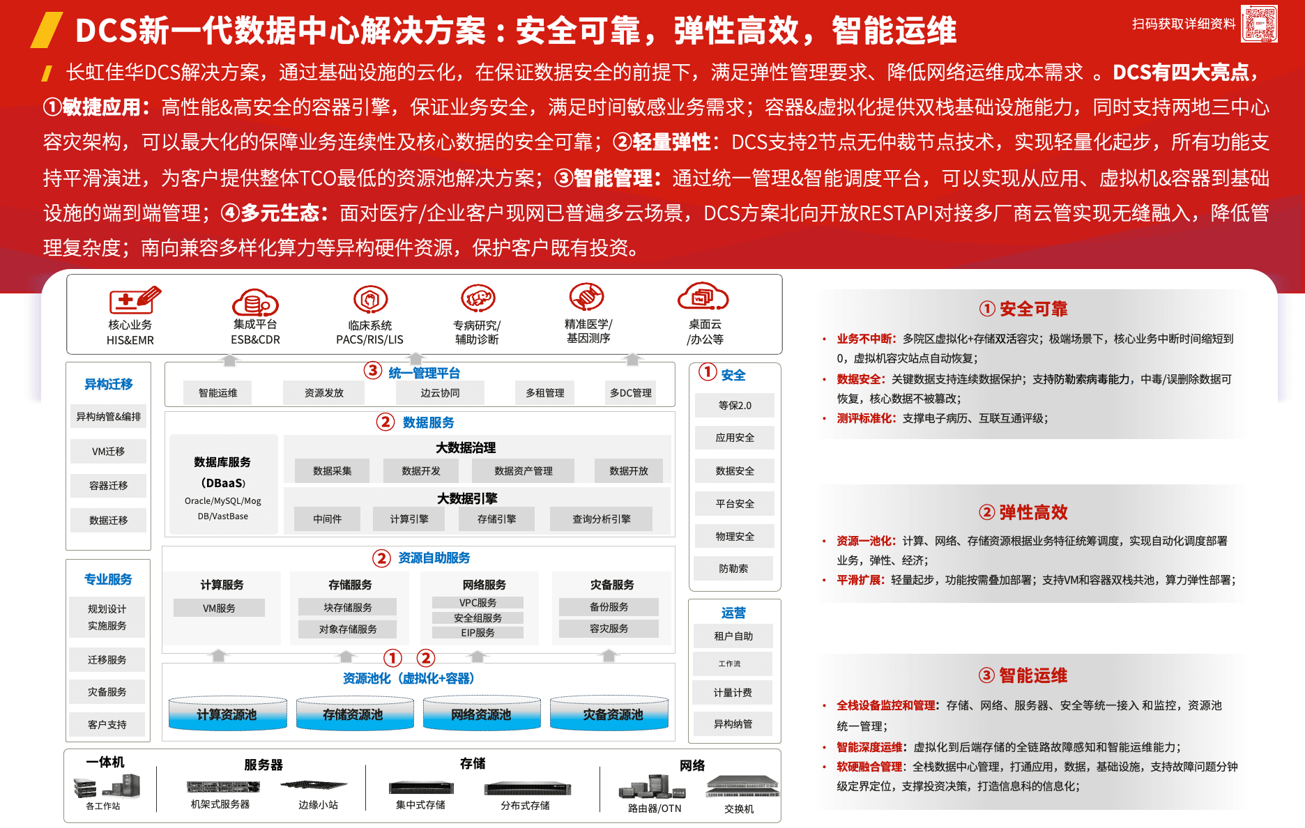 DCS(Datacenter Virtualization Solution)新一代数据中心重构医院数据中心,主要解决智慧医院建设过程中面临的测评要求、应用运营管理、运维软硬定界等三大挑战与问题,通过资源一个池、管理一体化、业务一平台(生态能力)构建全景智慧医院解决方案。