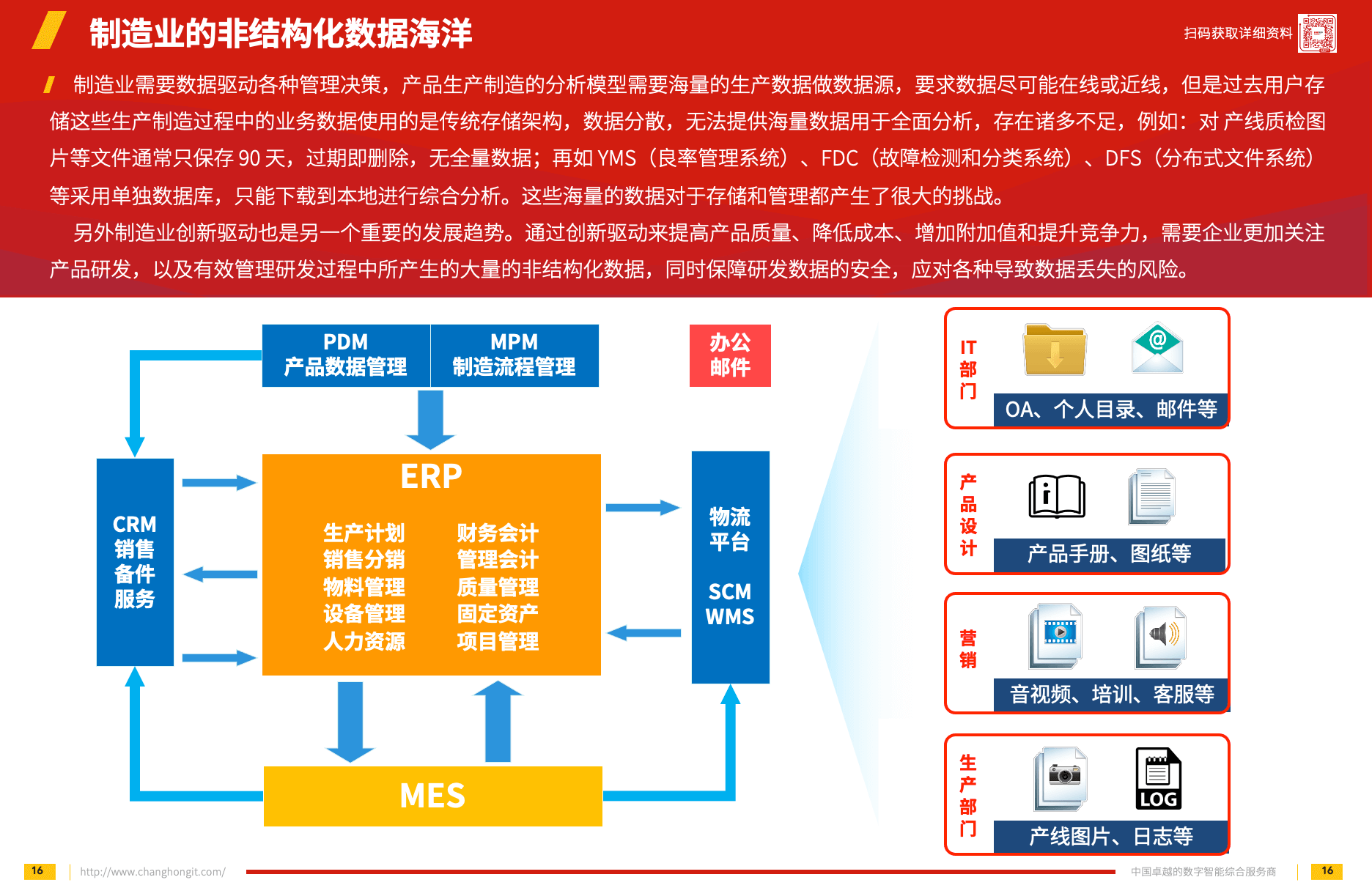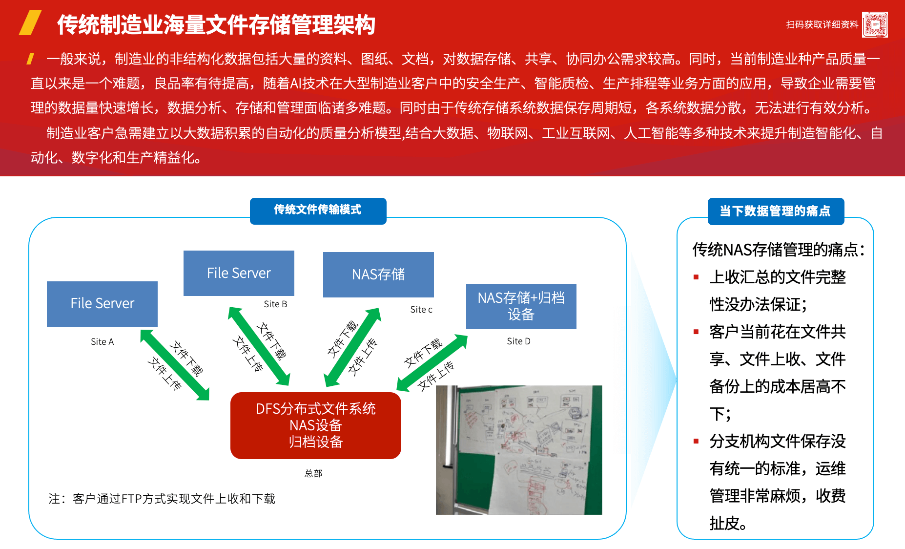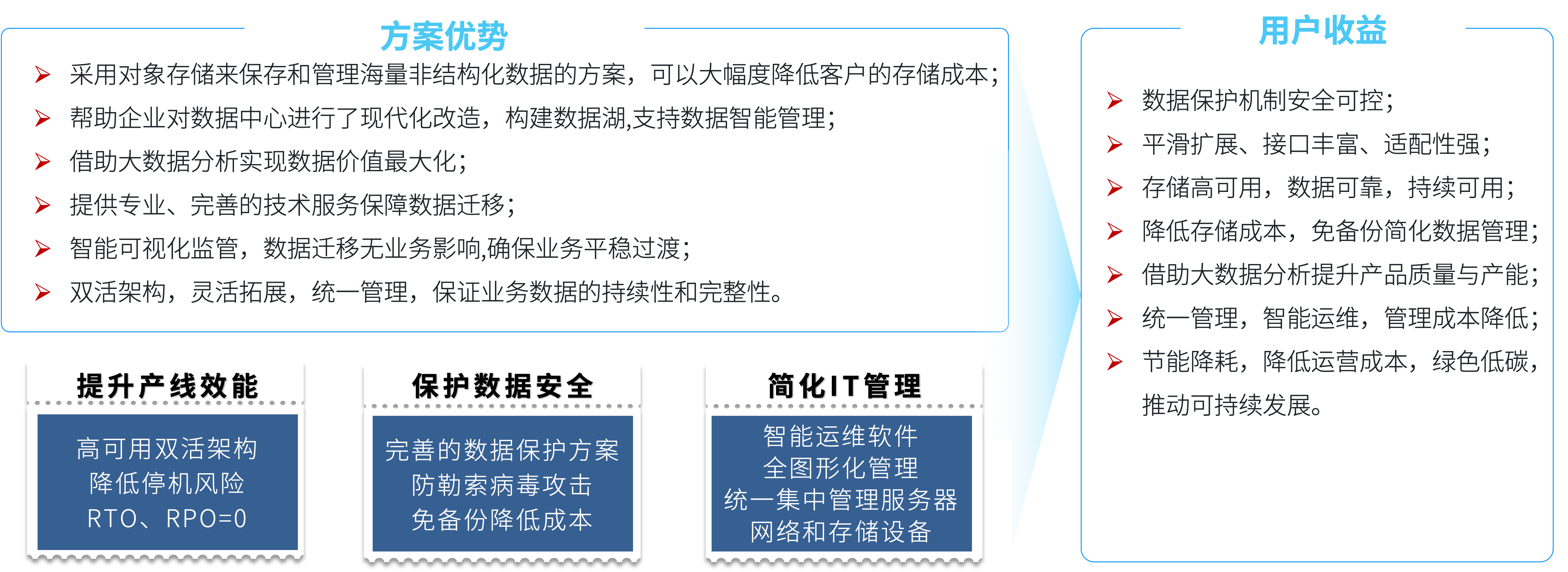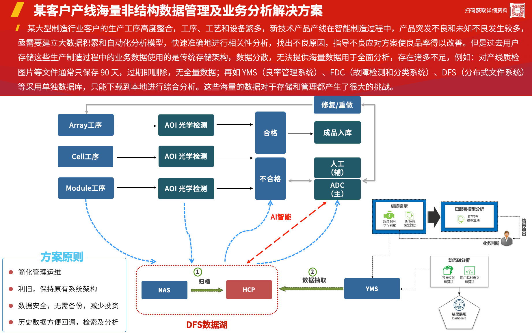 ? ? ? ? 制造业需要数据驱动各种管理决策,产品生产制造的分析模型需要海量的生产数据做数据源,要求数据尽可能在线或近线,但是过去用户存储这些生产制造过程中的业务数据使用的是传统存储架构,数据分散,无法提供海量数据用于全面分析,存在诸多不足,例如:对 产线质检图片等文件通常只保存 90 天,过期即删除,无全量数据;再如 YMS(良率管理系统)、FDC(故障检测和分类系统)、DFS(分布式文件系统) 等采用单独数据库,只能下载到本地进行综合分析。这些海量的数据对于存储和管理都产生了很大的挑战。