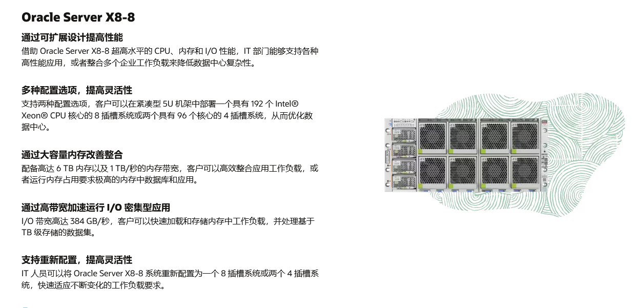 Oracle 服务器性能强大,能够以更少的系统整合更多工作负载,降低企业的资本支出和管理成本。同时,由于无需额外付费即可集成操作系统和虚拟化软件,企业可降低总拥有成本。