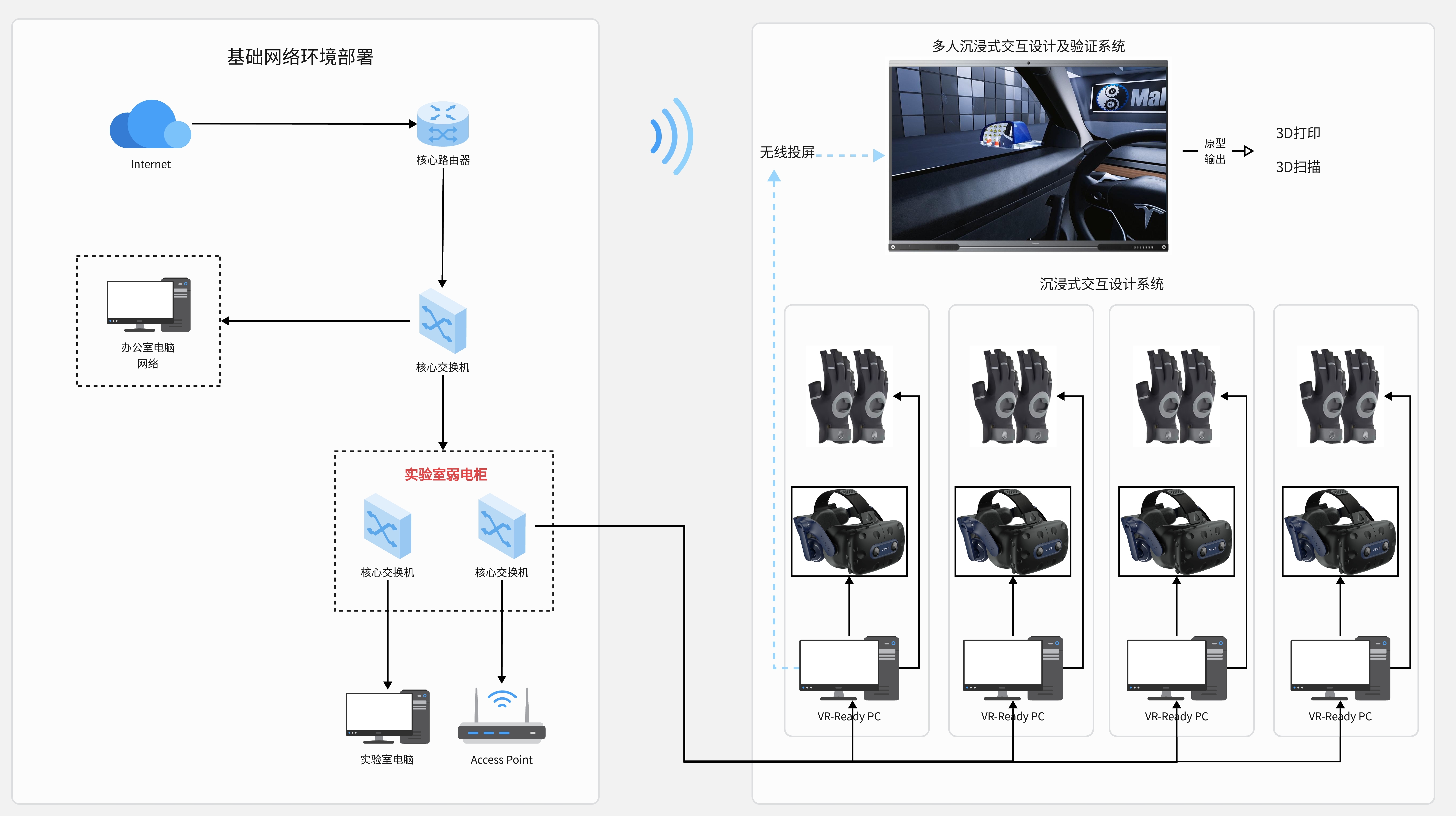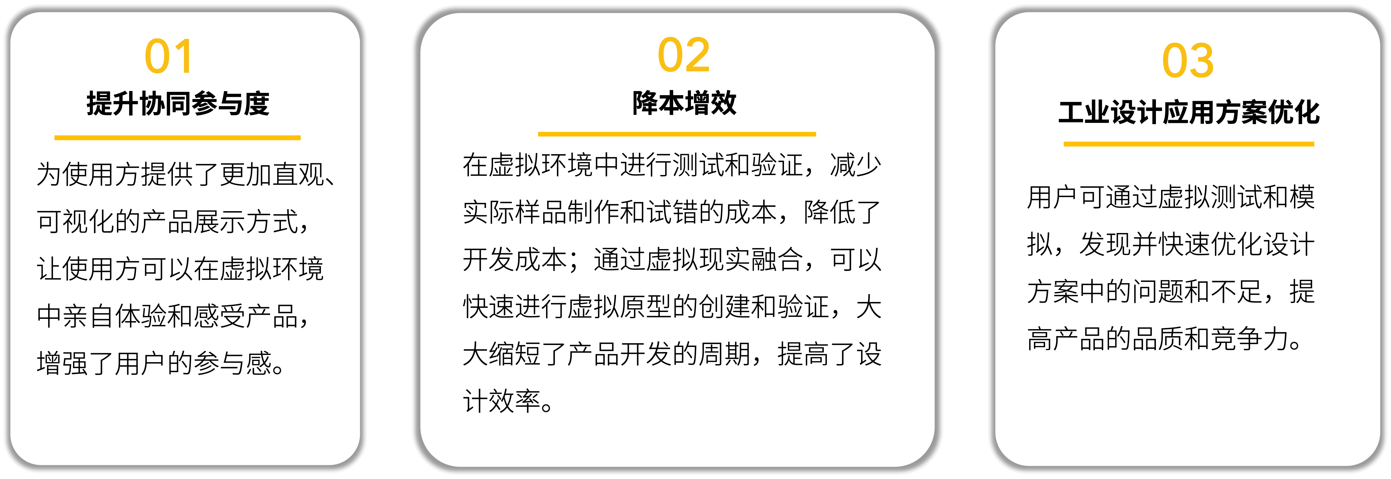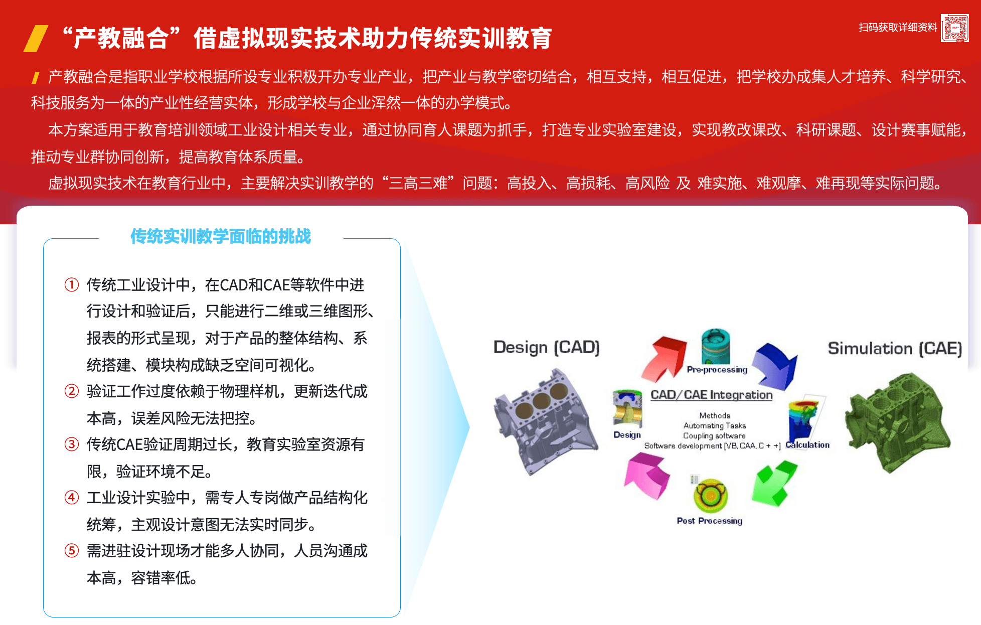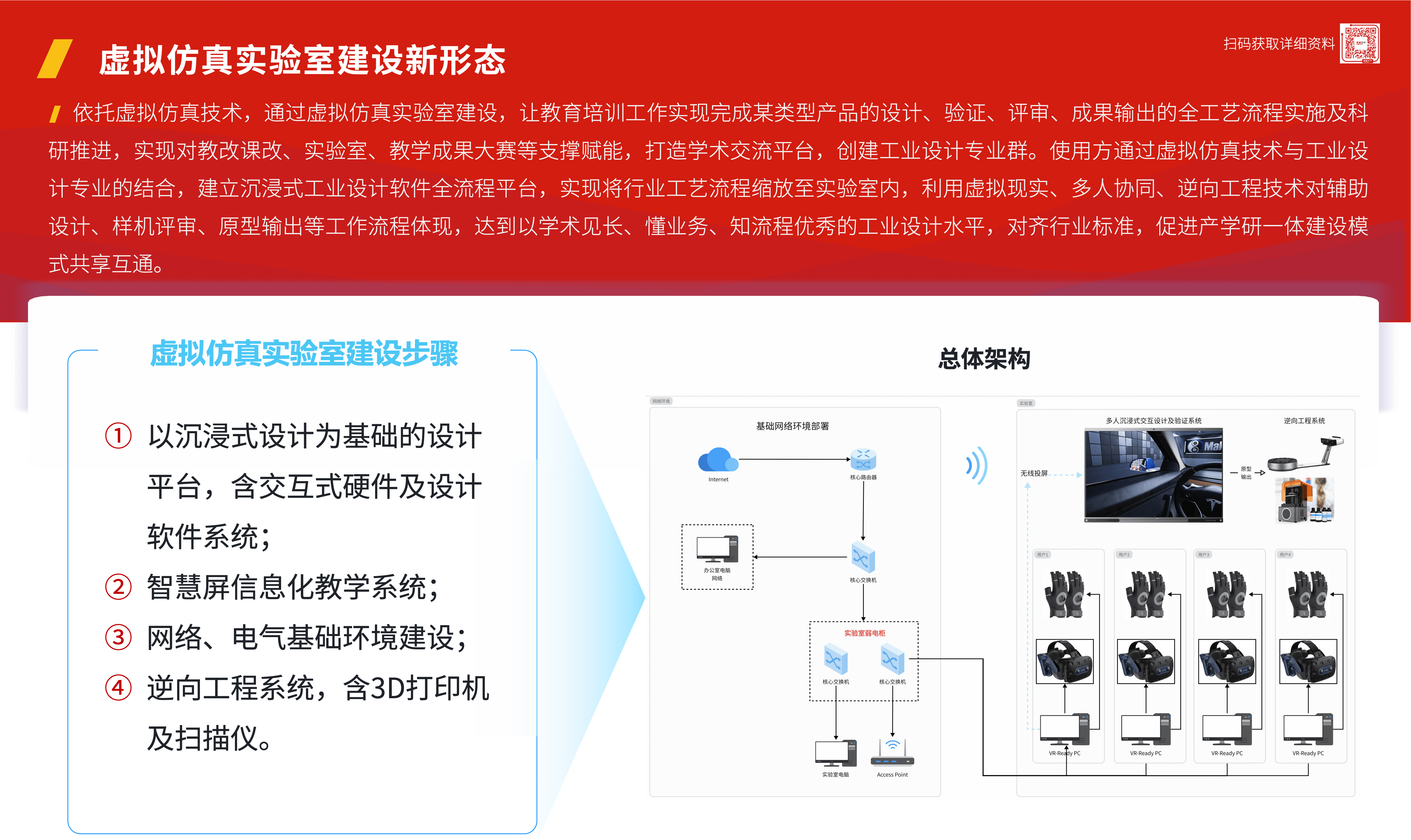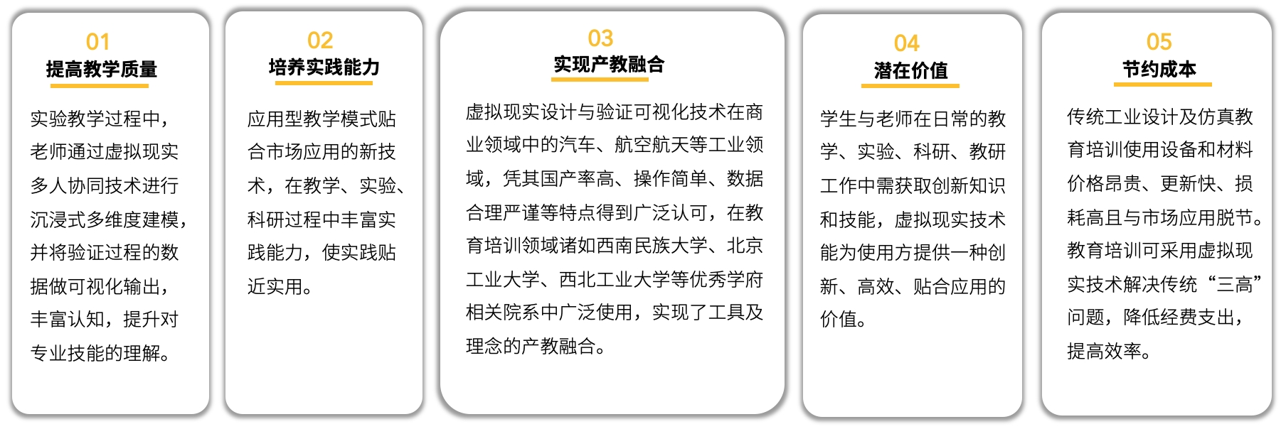 依托虚拟仿真技术,通过虚拟仿真实验室建设,让教育培训工作实现完成某类型产品的设计、验证、评审、成果输出的全工艺流程实施及科研推进,实现对教改课改、实验室、教学成果大赛等支撑赋能,打造学术交流平台,创建工业设计专业群。使用方通过虚拟仿真技术与工业设计专业的结合,建立沉浸式工业设计软件全流程平台,实现将行业工艺流程缩放至实验室内,利用虚拟现实、多人协同、逆向工程技术对辅助设计、样机评审、原型输出等工作流程体现,达到以学术见长、懂业务、知流程优秀的工业设计水平,对齐行业标准,促进产学研一体建设模式共享互通。